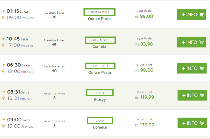 Existem diferentes tipos de ônibus para sua viagem: convencional, executivo, semi leito e leito.Uns mais confortáveis, outros mais baratos.